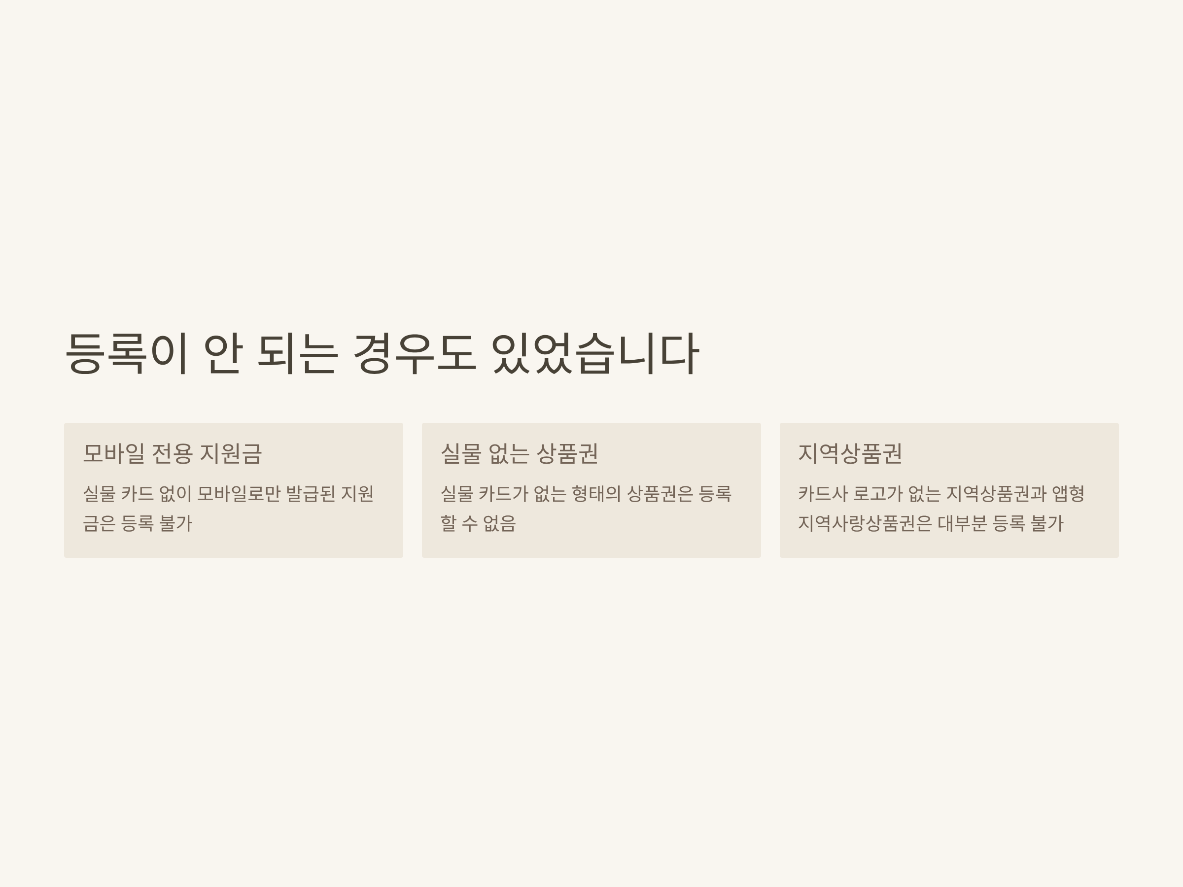 | 선불형 지역상품권 | 일부 지역/카드사 미지원 | 고객센터 문의, 실물카드 여부 확인 |