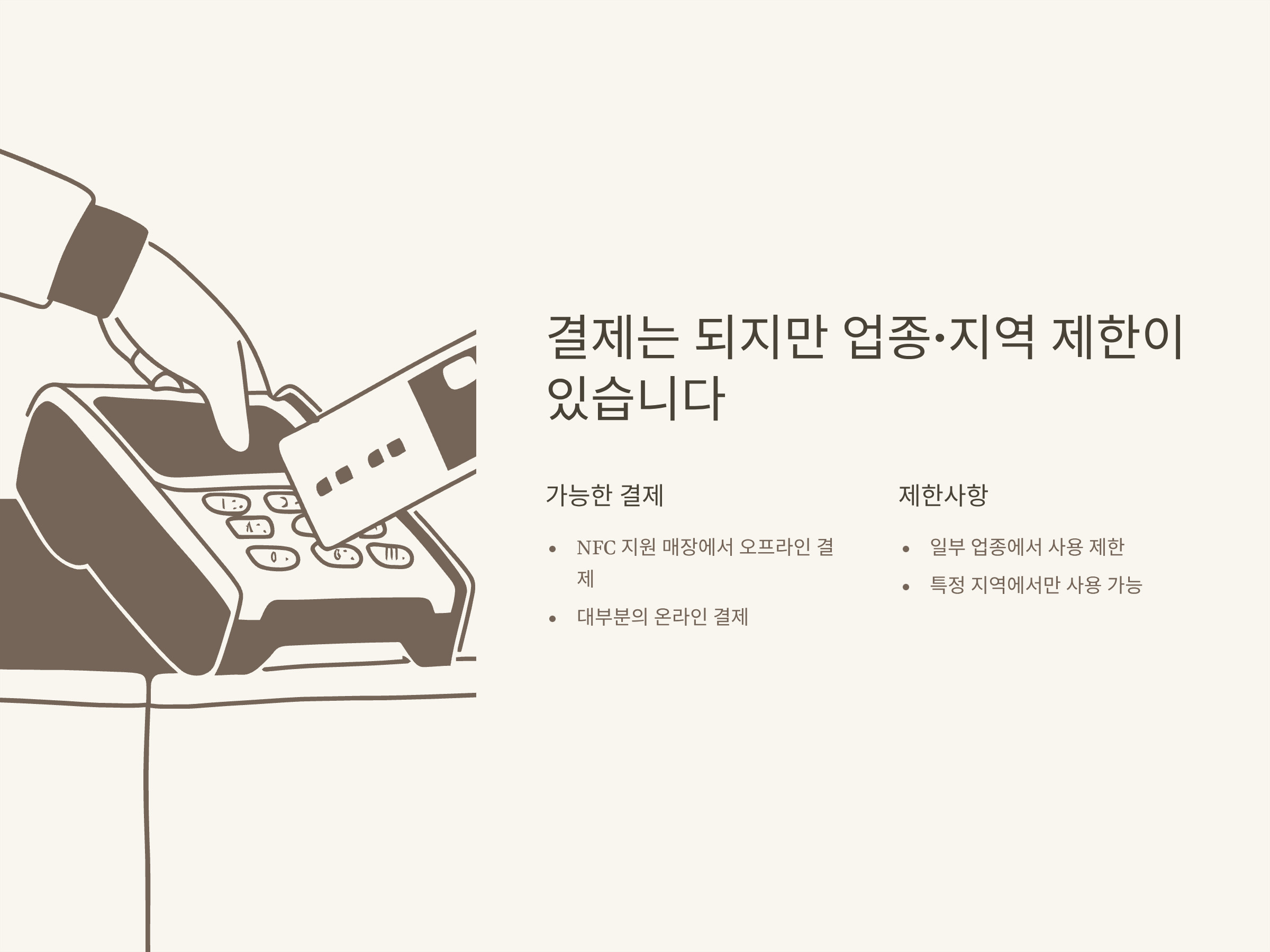 | 일부 업종(유흥, 특정 해외 결제 등) | 불가 | 지원금/카드사 제한 |