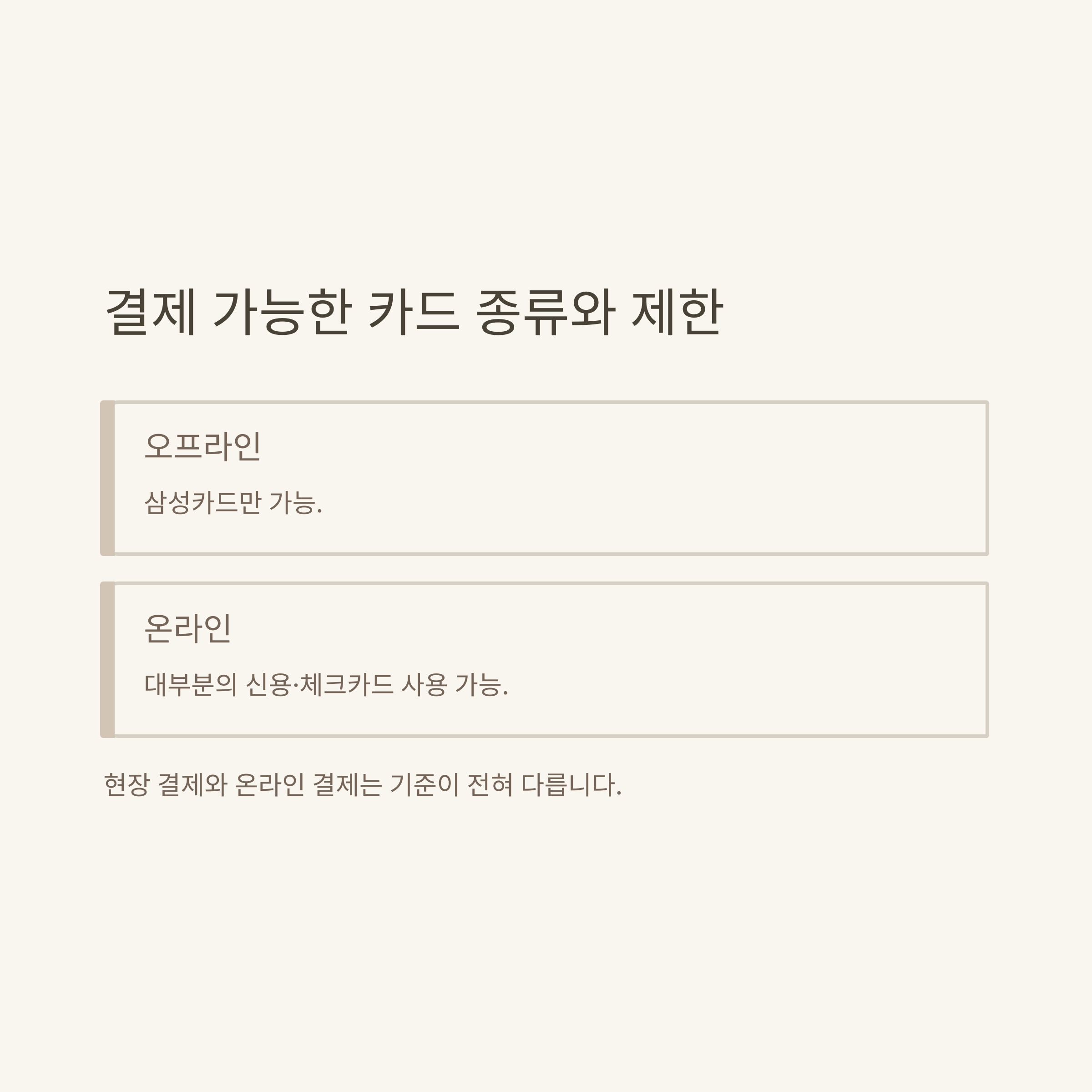 A. 삼성카드와의 단독 제휴로 인해 오프라인 매장에선 삼성카드만 결제 가능합니다.