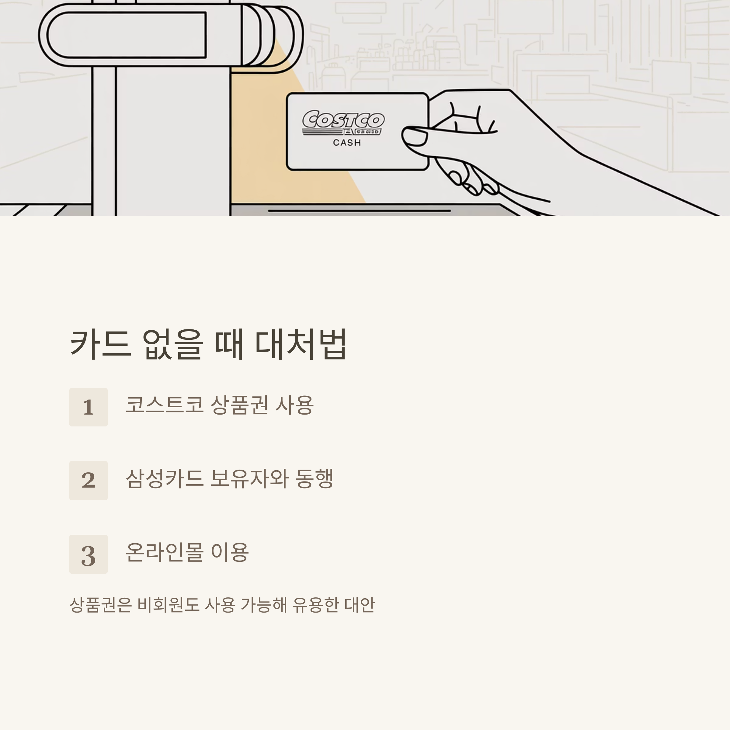 가장 대표적인 방법이 코스트코 상품권을 미리 준비하는 것입니다. 상품권은 회원권이 없어도 누구나 구입 가능하며, 현장 결제 시 사용할 수 있어서 비회원 동행 시에도 유용하게 쓰입니다. 또, 삼성카드가 있는 지인과 동행해 결제 후 현금정산을 하는 방법도 실제로 많이 활용하더라고요.