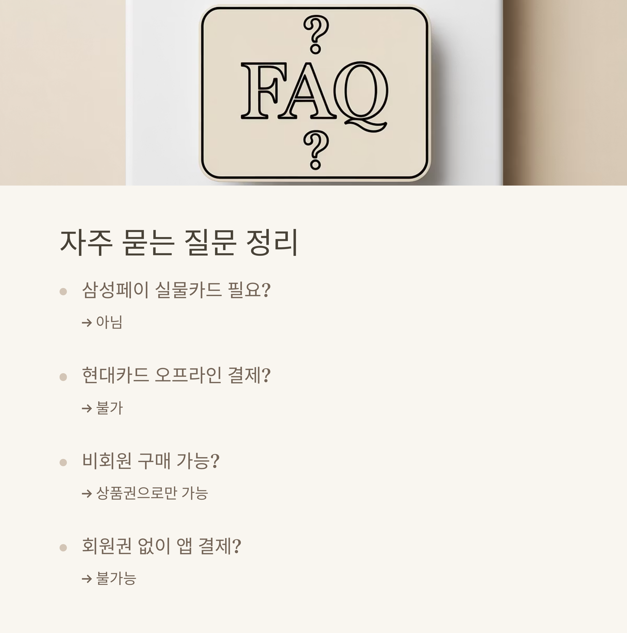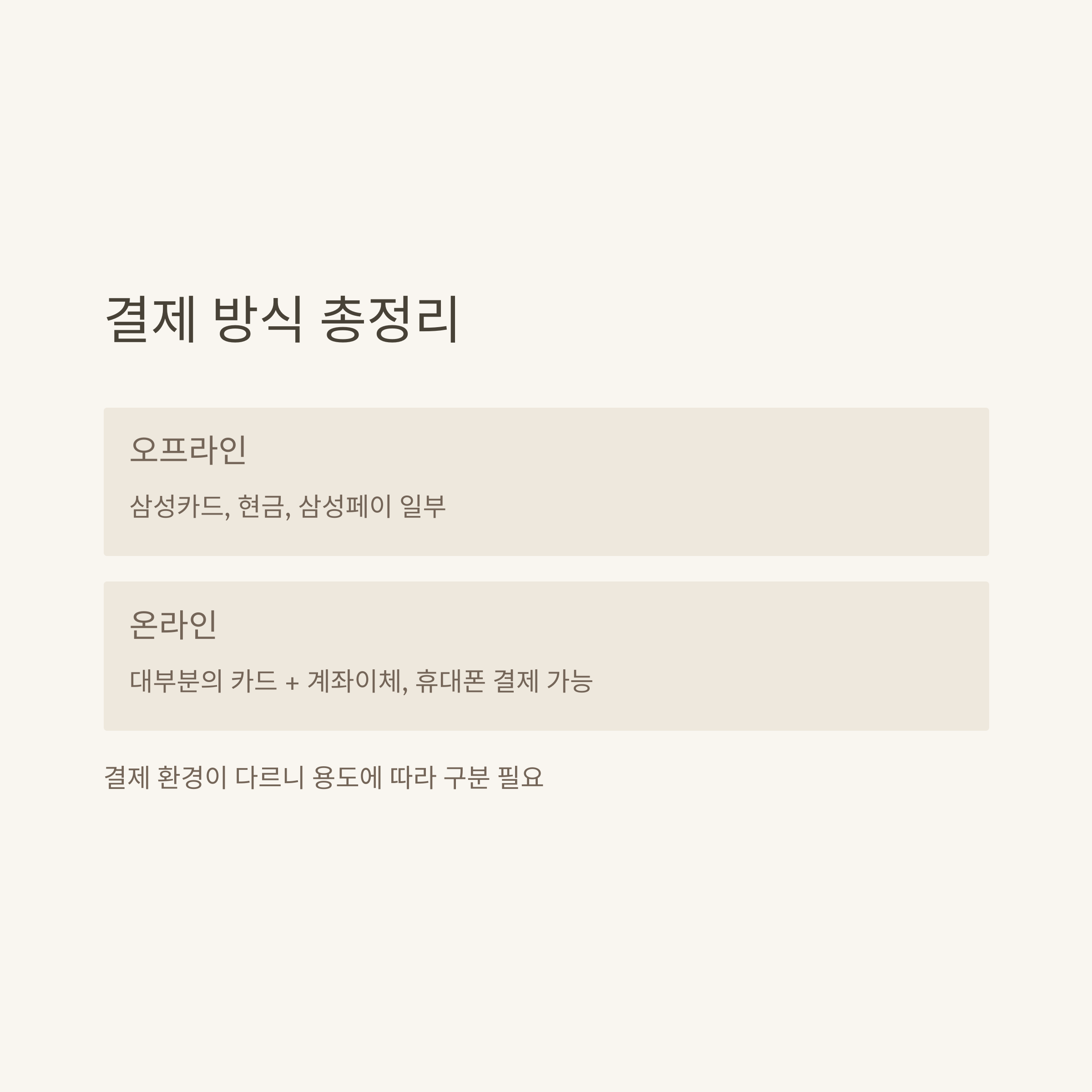 | 결제카드 | 삼성카드(신용/체크), 삼성페이 | 삼성, 신한, 현대, 롯데, 국민 등 전 카드 |