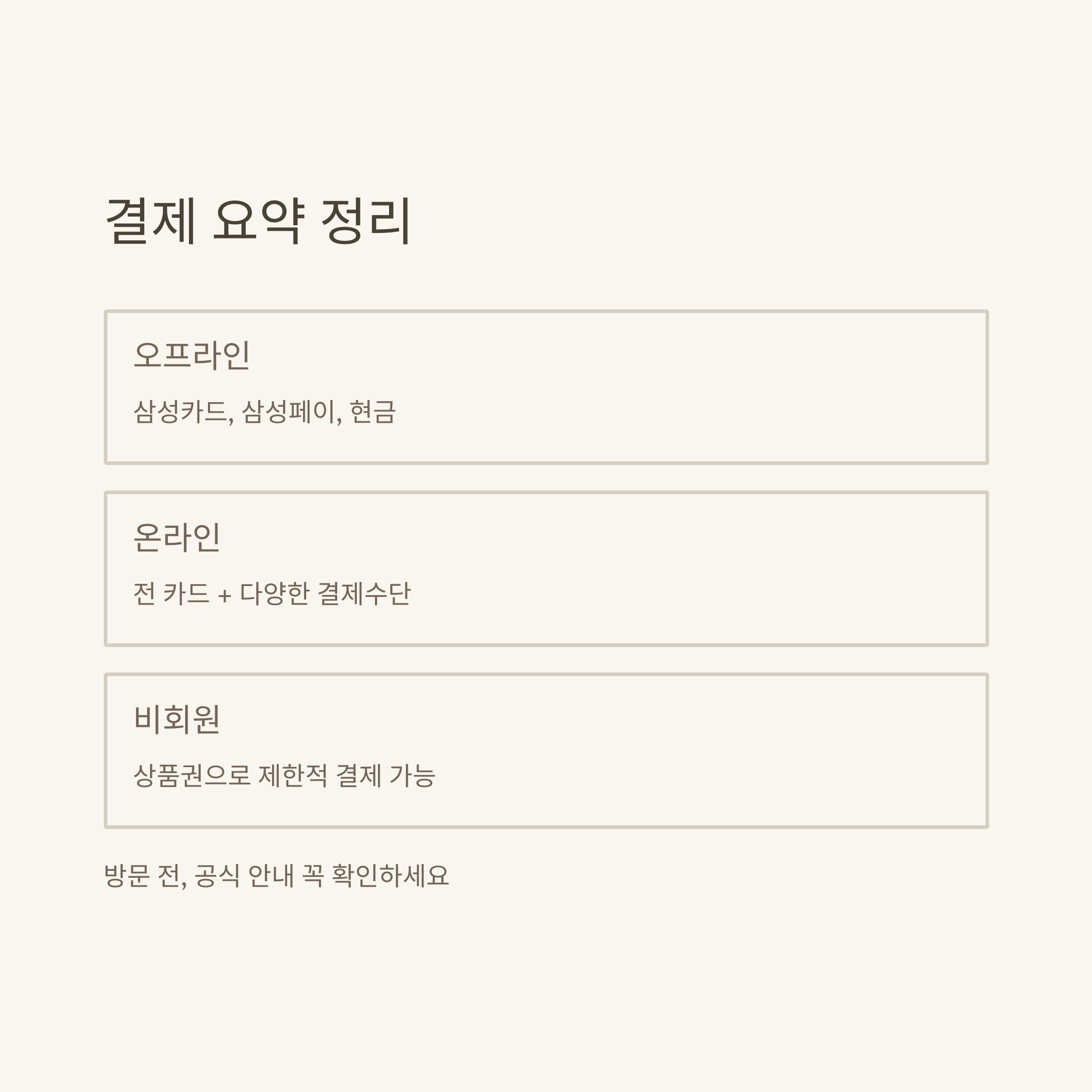 | 기타 | 현금, 삼성페이, 선불카드 일부 가능 | 계좌이체, 휴대폰결제, 상품권 등 가능 |