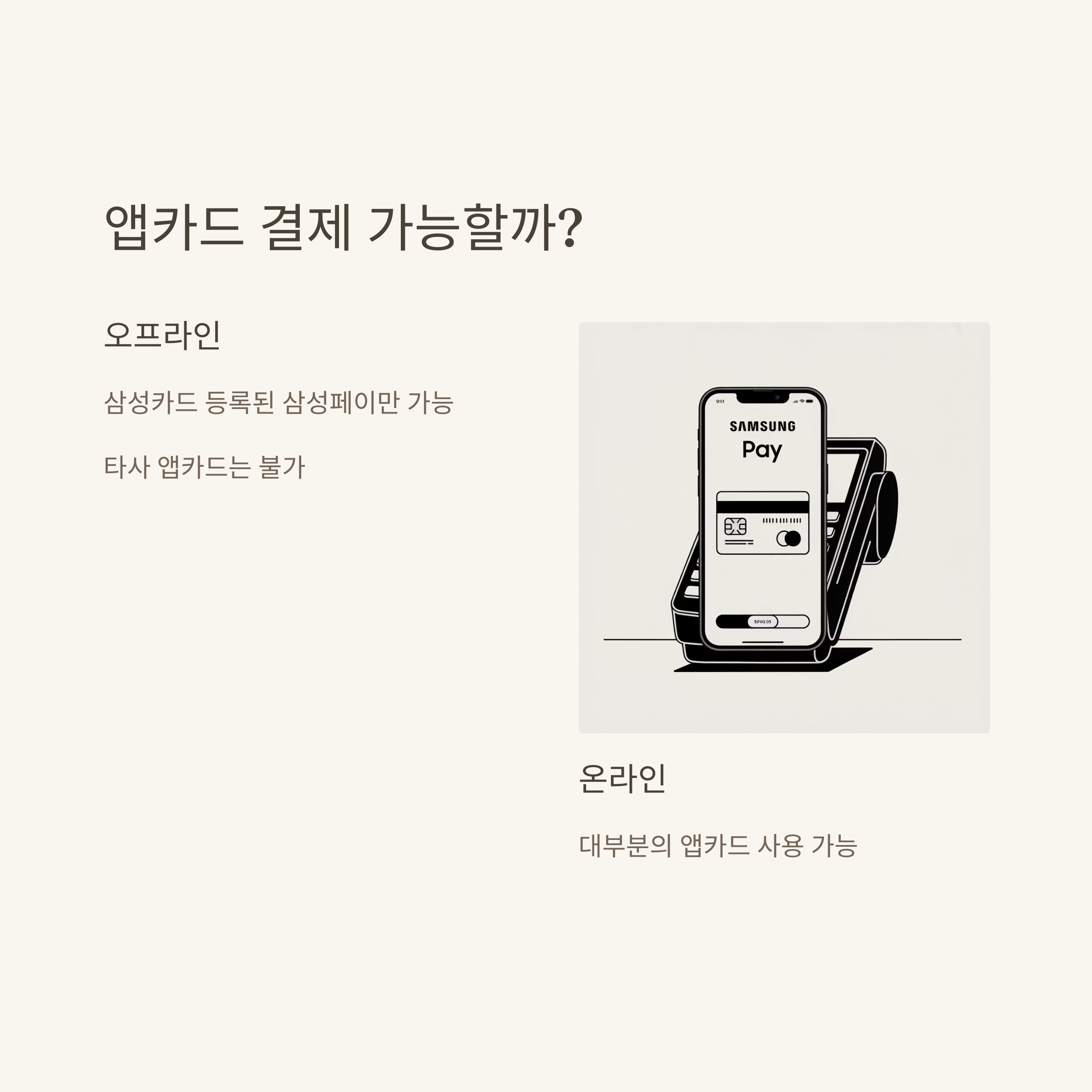| 앱/모바일결제 | 삼성페이(삼성카드 연결 필수) | 삼성페이, 네이버페이 등 일부 가능 |