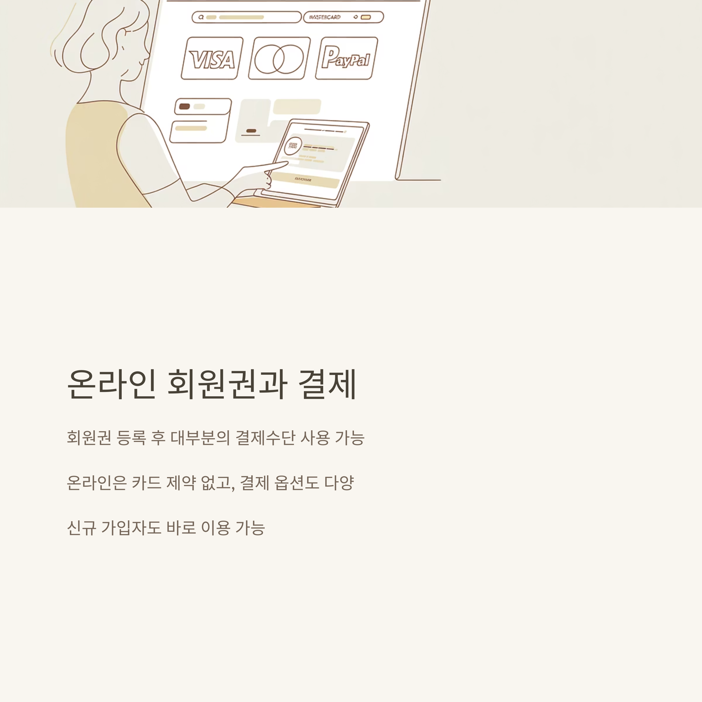 온라인몰에서는 신용·체크카드 외에도 계좌이체, 휴대폰결제, 상품권 등 다양한 결제 옵션이 제공됩니다. 다만, 온라인 회원권과 오프라인 회원권은 완전히 동일하게 취급되기 때문에, 회원권이 없다면 상품구매가 제한될 수 있습니다.