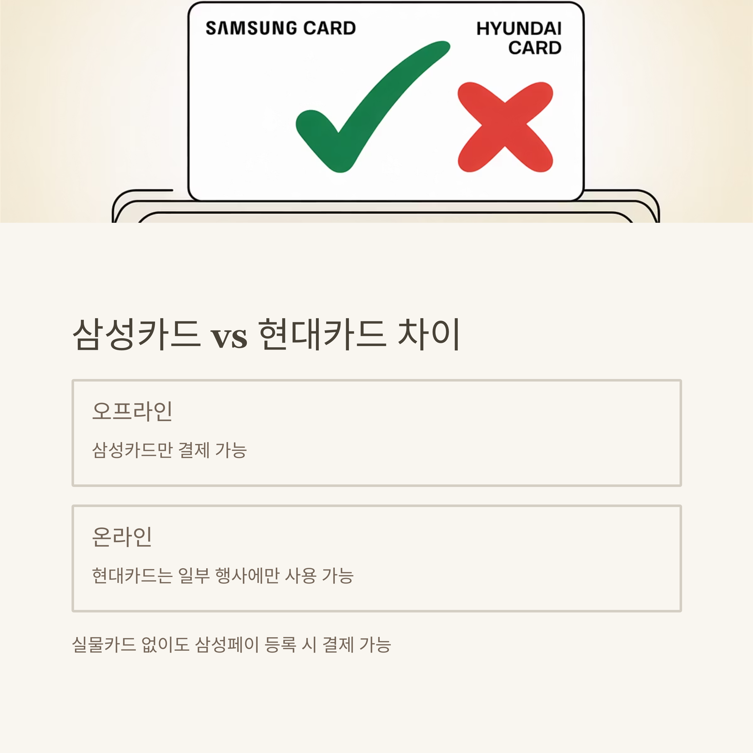 | 주요 카드 | 삼성카드(신용/체크), 삼성페이 | 삼성, 신한, 현대, 롯데, 국민 등 |